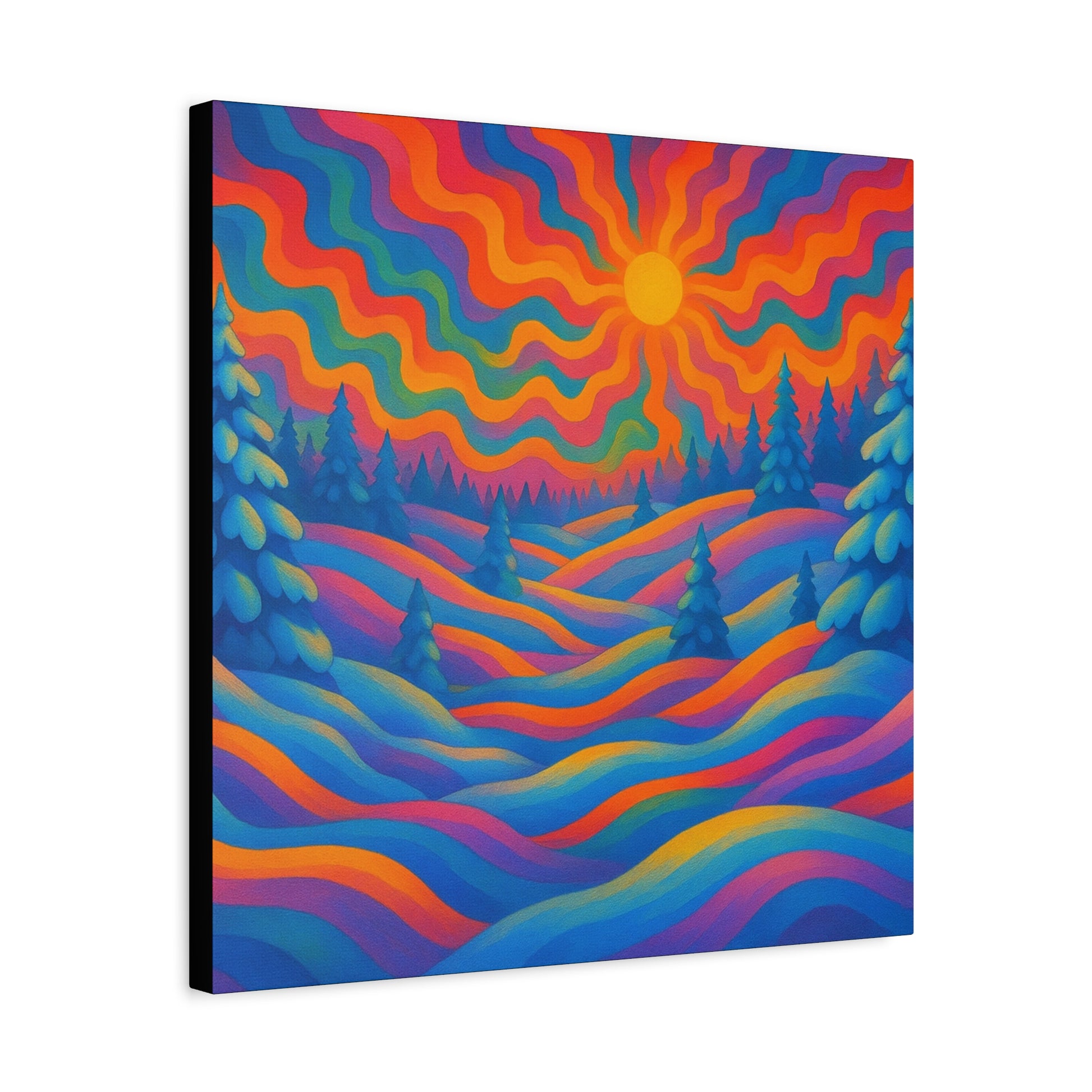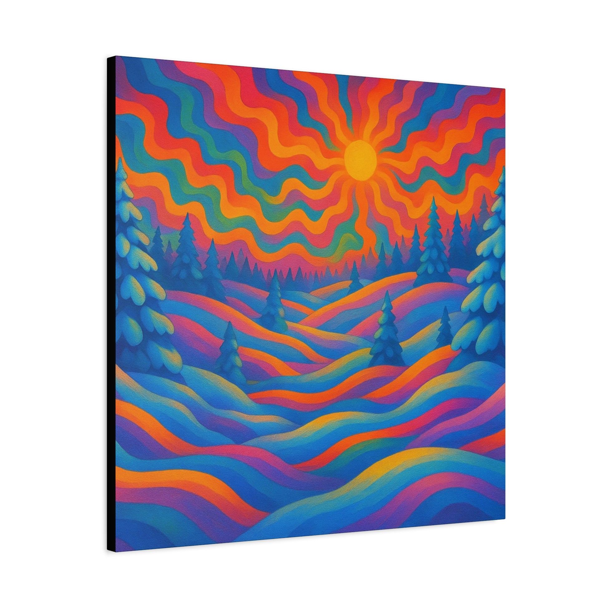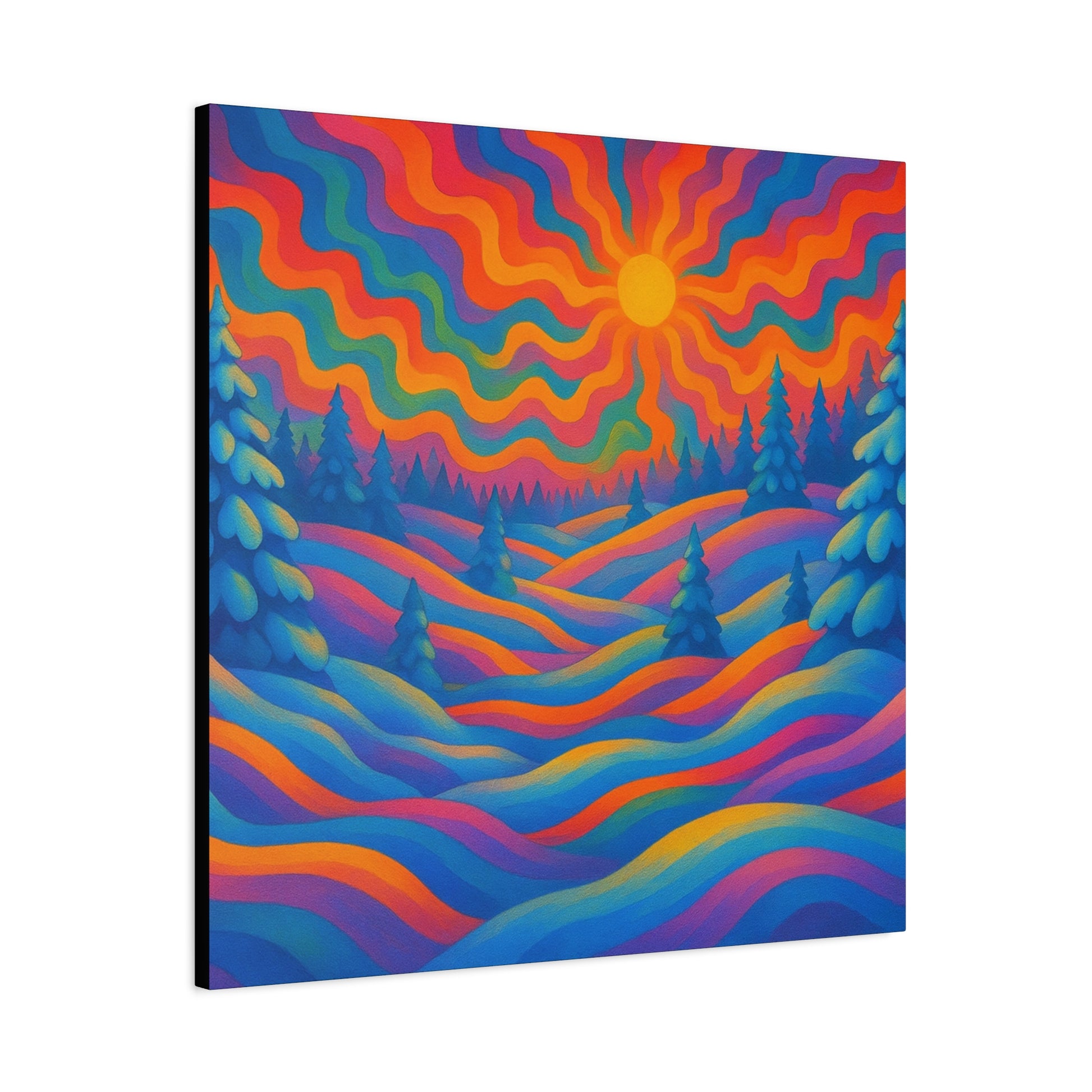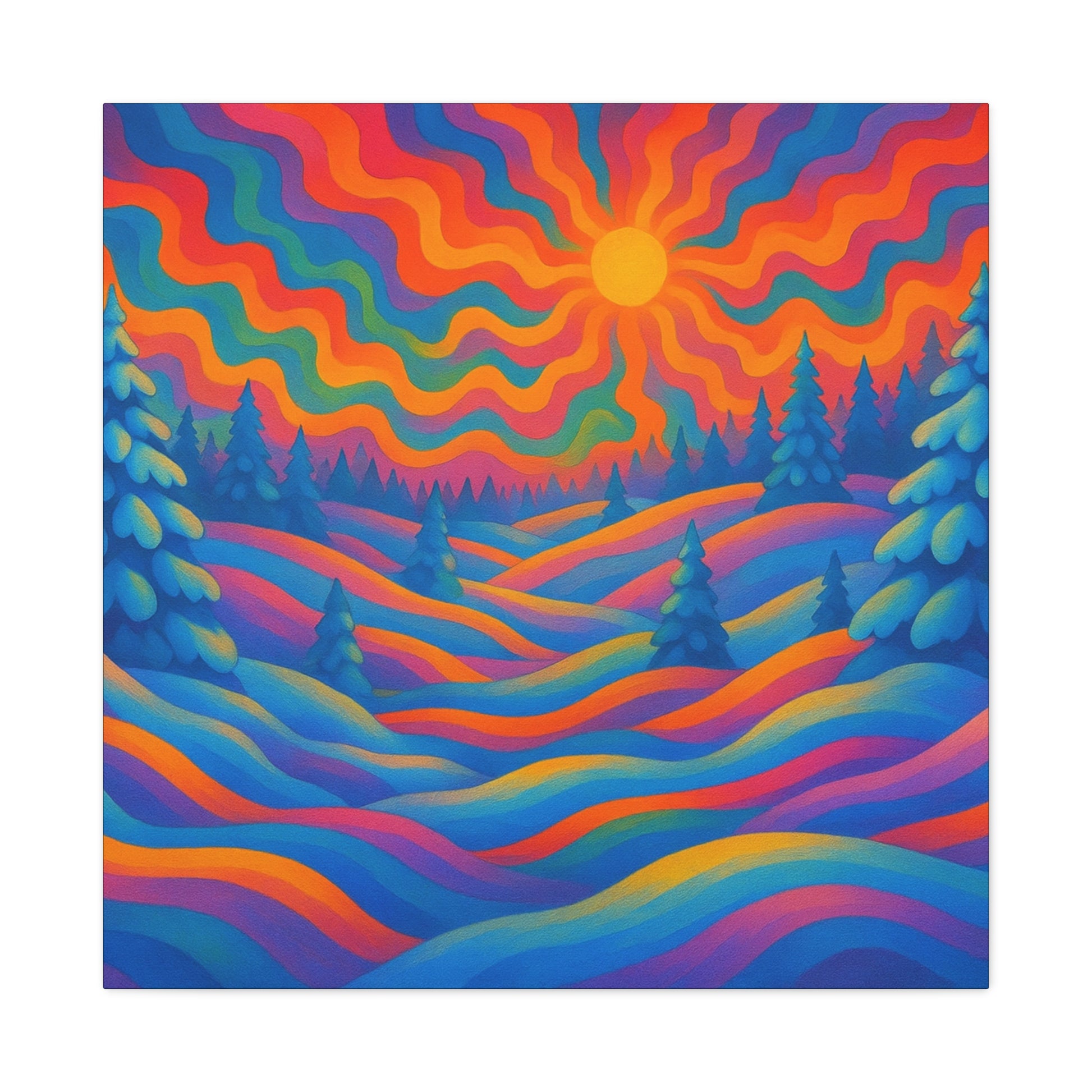 En levande, stretched matt canvas som för ett drömliknande landskap in i ditt rum. Vågor av mättade färger rullar över kullar och frostiga granar under en varm, vågig sol — ett konstverk som läses som ett minne av en föreställd skymning. Den mjuka, icke-reflekterande matta finishen håller varje nyans rik och sammetslen, medan den galleristilsmässiga 1,25" stretch och svartmålade sidor ger en ren, modern närvaro på väggen. Byggd på hållbart radiata tall och tryckt med giftfria latexfärger känns denna canvas både modern och medveten. Små gummikuddar på baksidan håller den stabil, och den medföljande upphängningsutrustningen gör installationen enkel. Finns i flera orienteringar och storlekar för att passa mysiga hörn eller breda funktionsväggar.
