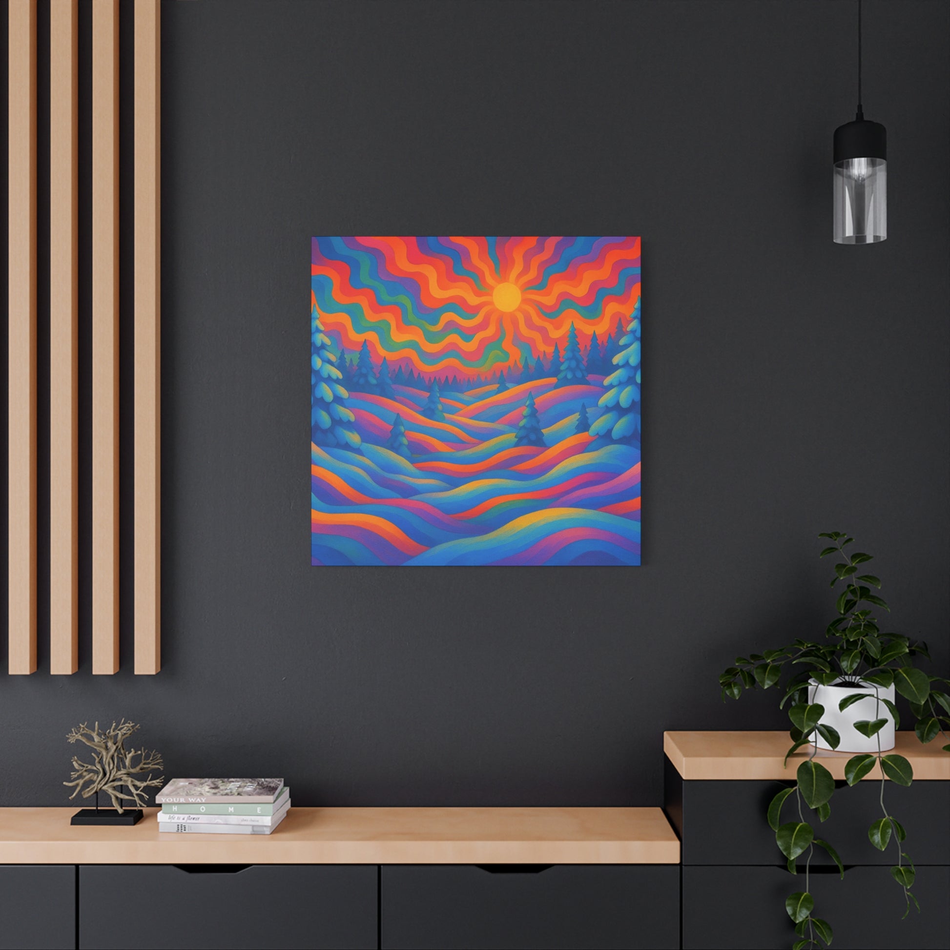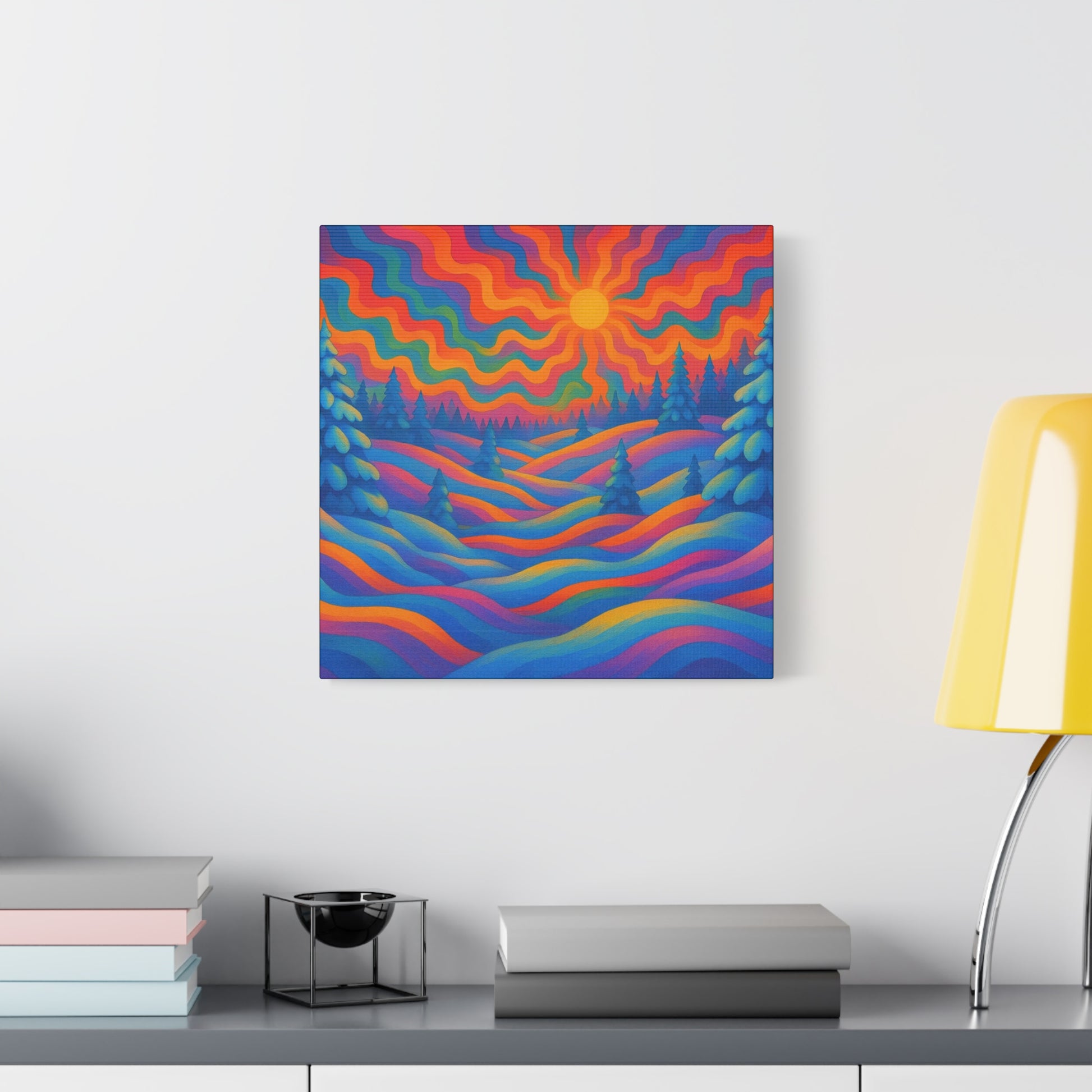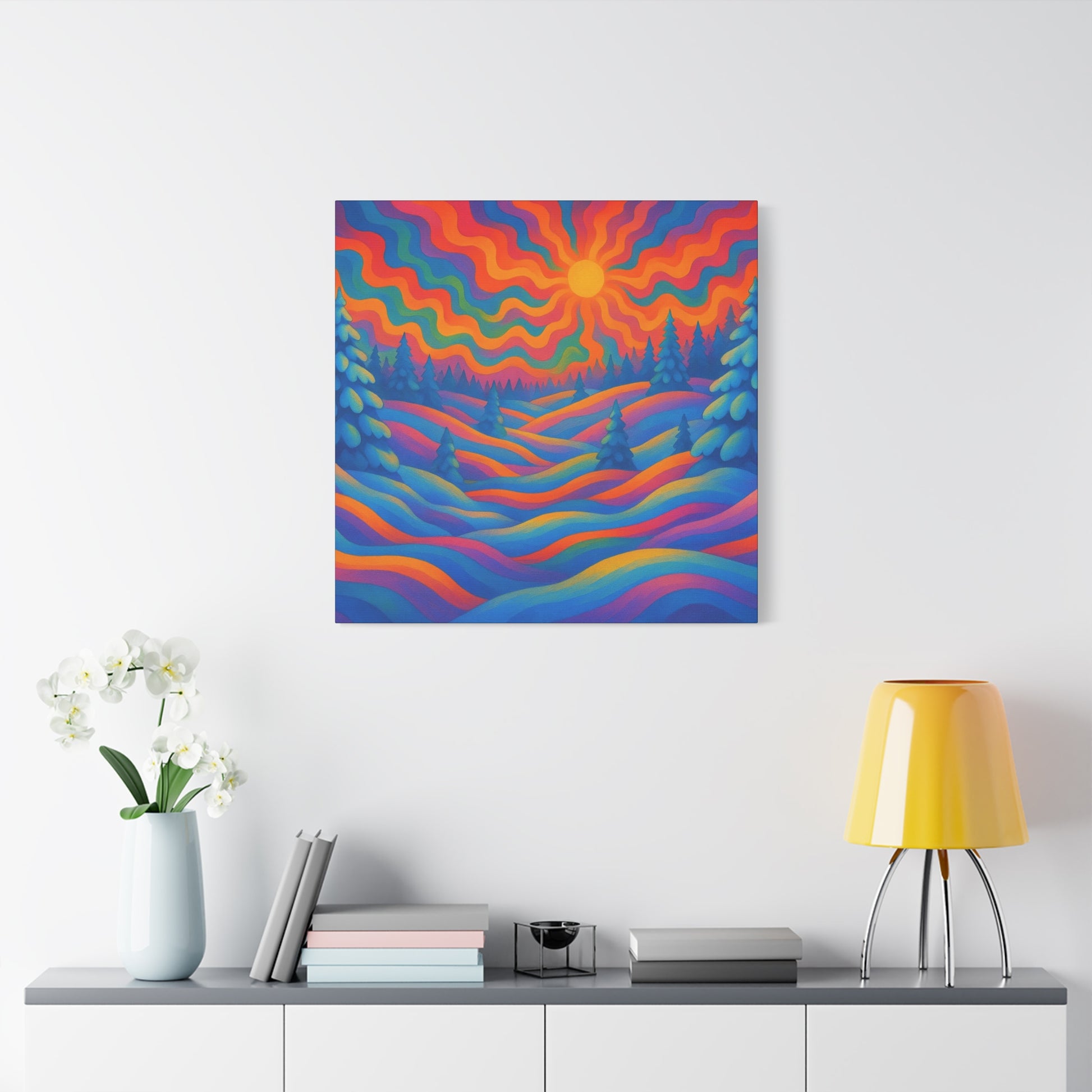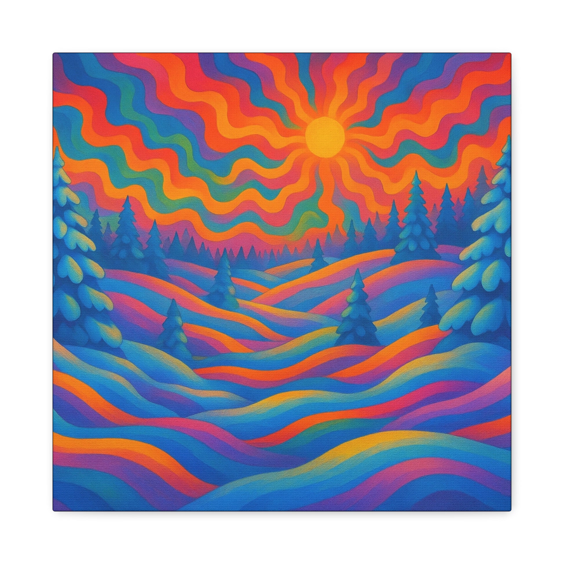 En levande, stretched matt canvas som för ett drömliknande landskap in i ditt rum. Vågor av mättade färger rullar över kullar och frostiga granar under en varm, vågig sol — ett konstverk som läses som ett minne av en föreställd skymning. Den mjuka, icke-reflekterande matta finishen håller varje nyans rik och sammetslen, medan den galleristilsmässiga 1,25" stretch och svartmålade sidor ger en ren, modern närvaro på väggen. Byggd på hållbart radiata tall och tryckt med giftfria latexfärger känns denna canvas både modern och medveten. Små gummikuddar på baksidan håller den stabil, och den medföljande upphängningsutrustningen gör installationen enkel. Finns i flera orienteringar och storlekar för att passa mysiga hörn eller breda funktionsväggar.