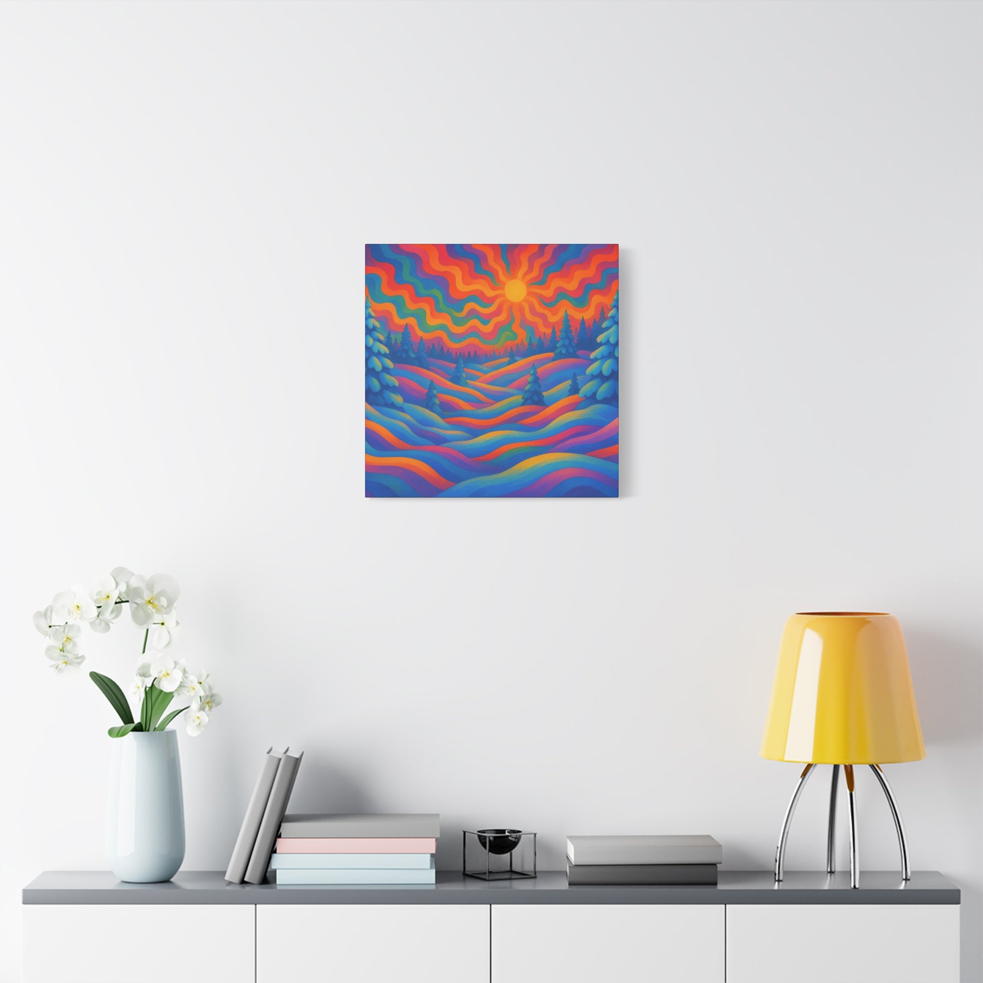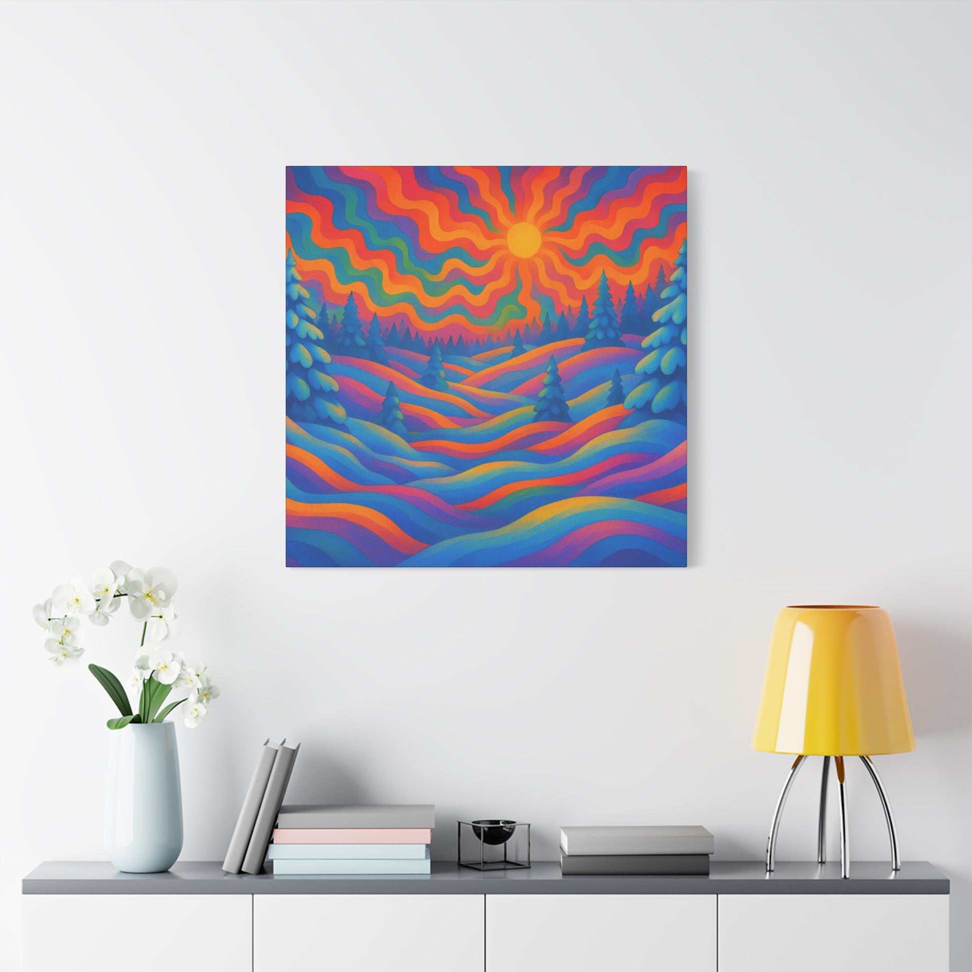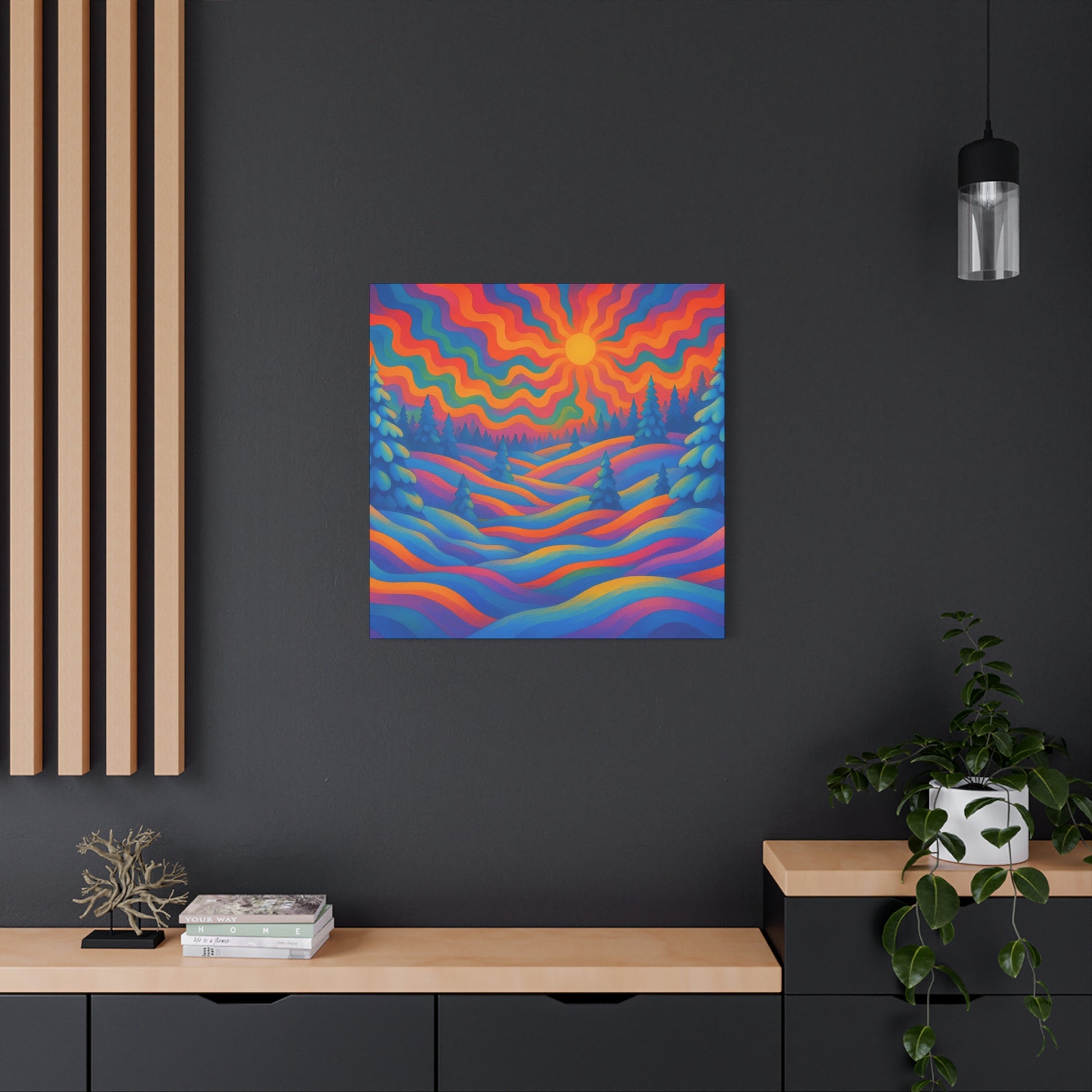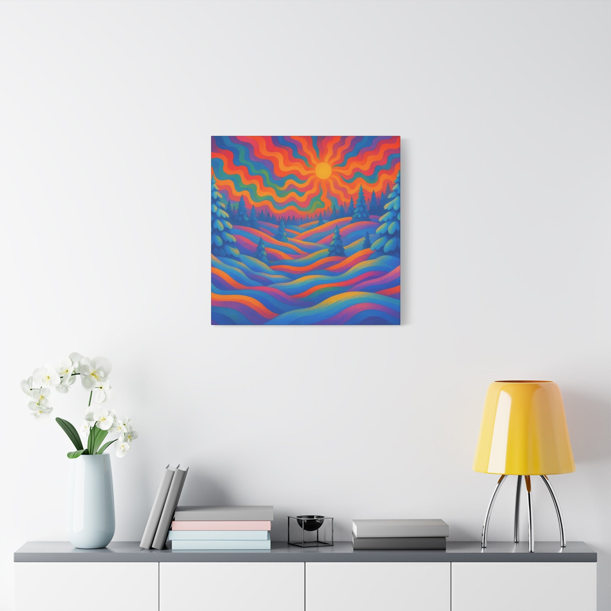 En levande, stretched matt canvas som för ett drömliknande landskap in i ditt rum. Vågor av mättade färger rullar över kullar och frostiga granar under en varm, vågig sol — ett konstverk som läses som ett minne av en föreställd skymning. Den mjuka, icke-reflekterande matta finishen håller varje nyans rik och sammetslen, medan den galleristilsmässiga 1,25" stretch och svartmålade sidor ger en ren, modern närvaro på väggen. Byggd på hållbart radiata tall och tryckt med giftfria latexfärger känns denna canvas både modern och medveten. Små gummikuddar på baksidan håller den stabil, och den medföljande upphängningsutrustningen gör installationen enkel. Finns i flera orienteringar och storlekar för att passa mysiga hörn eller breda funktionsväggar.